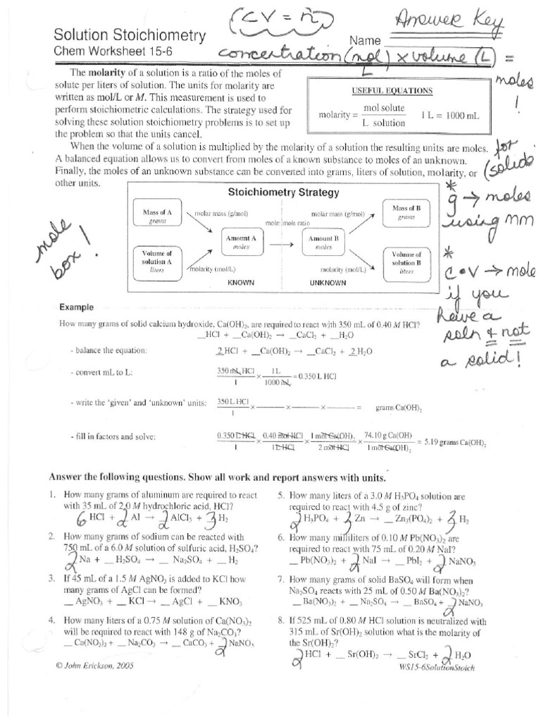 Solution Stoichiometry Chem Worksheet 15 6 Answer Key